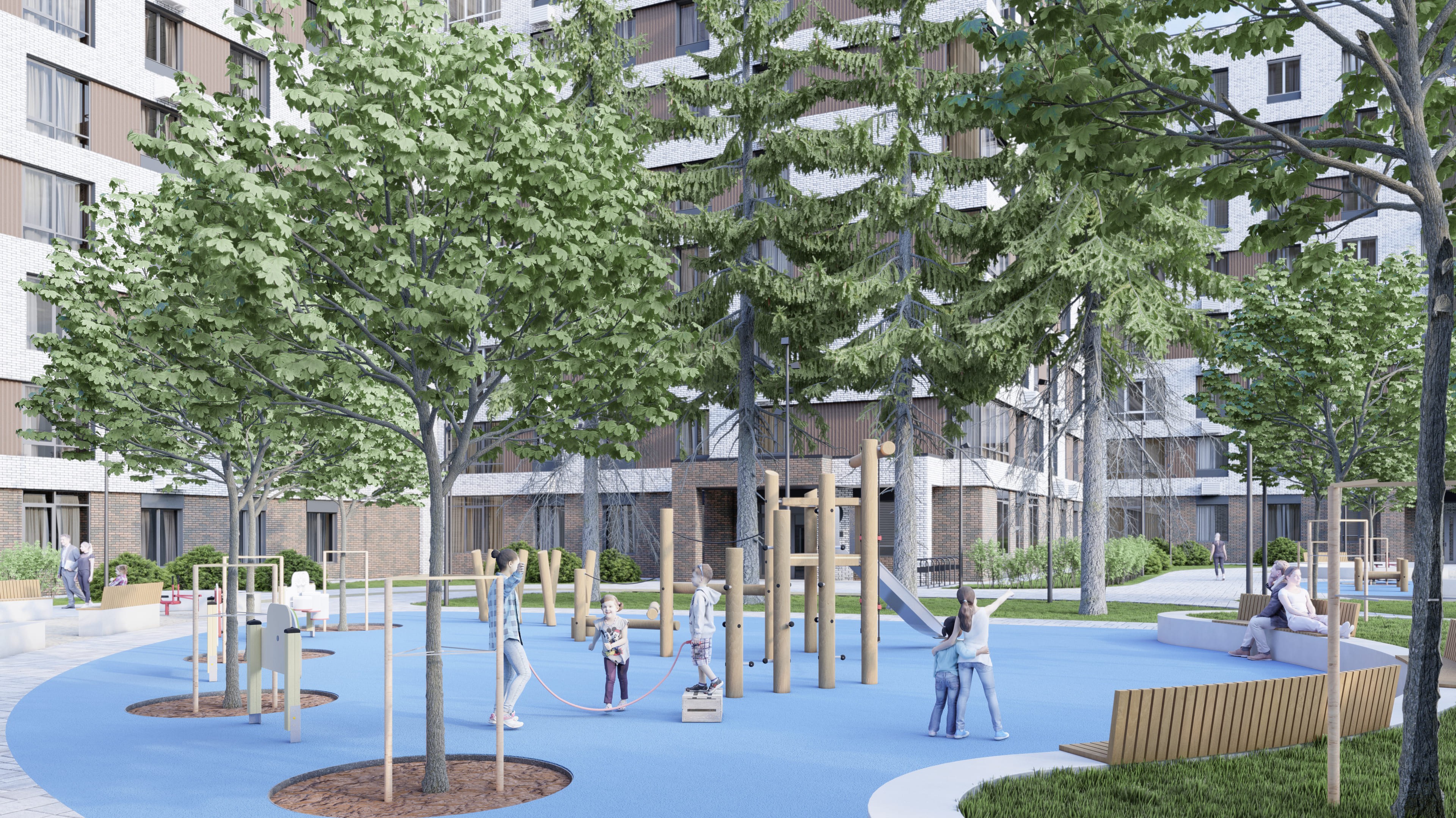 Дворы без машин, зелёные парковые зоны с площадками для детей и взрослых, а также безопасная и уютная атмосфера.