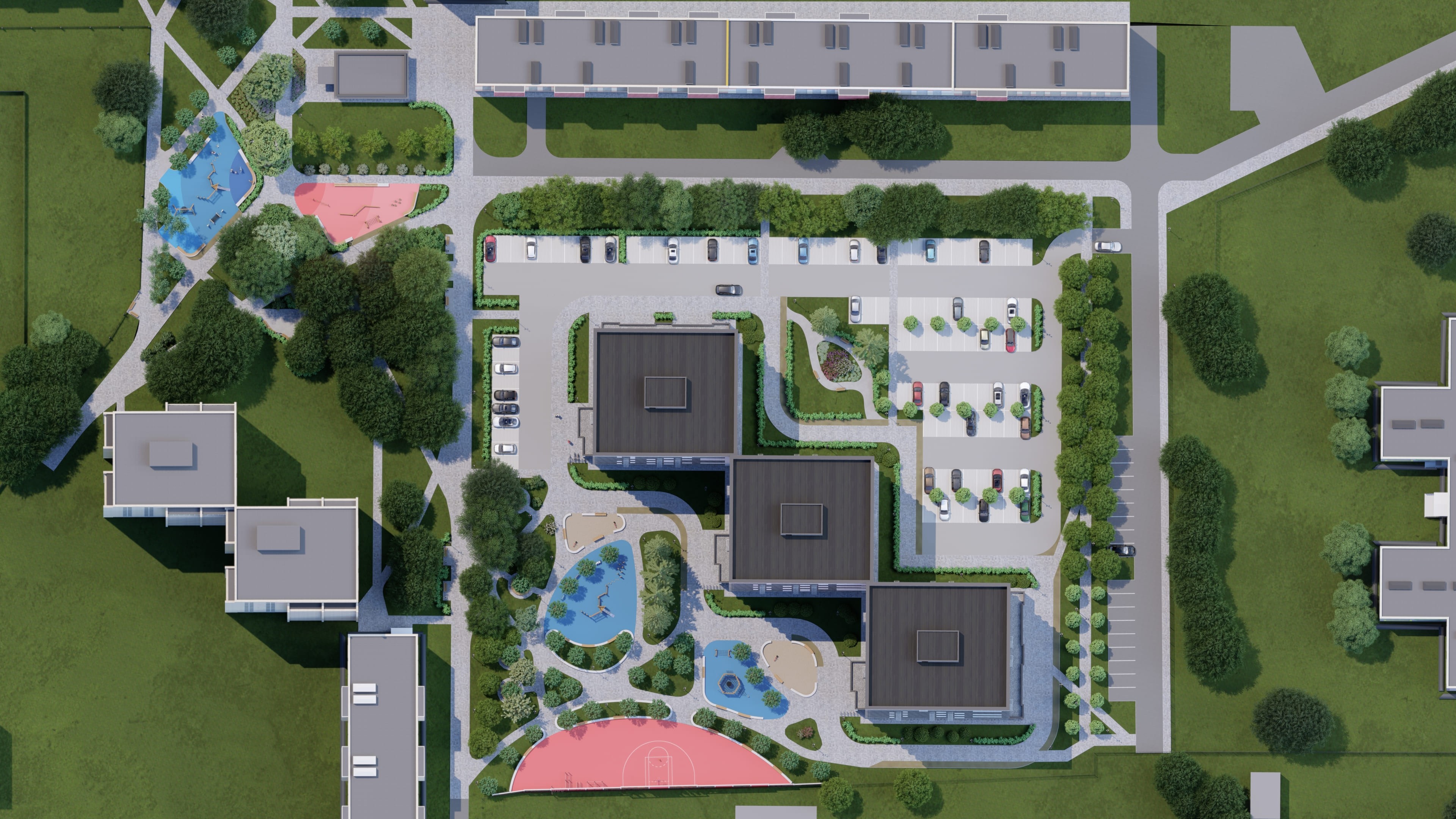 Жилой комплекс окружён обустроенными парками и зелёными зонами, предоставляя жителям возможность наслаждаться природой прямо у дома. Удобная транспортная доступность и наличие городских маршрутов делают перемещения по городу быстрыми и комфортными, обеспечивая лёгкий доступ к важным точкам города.