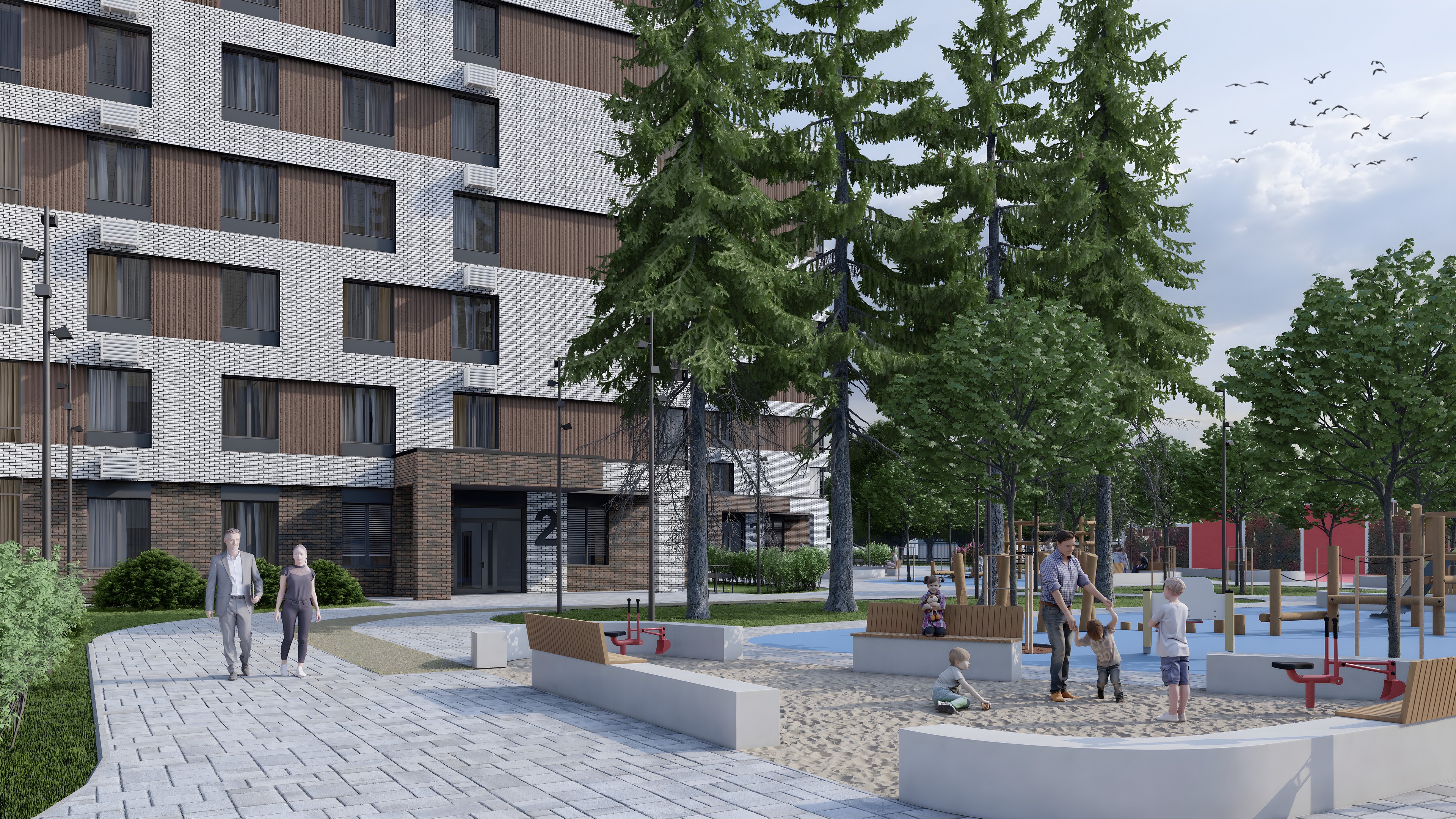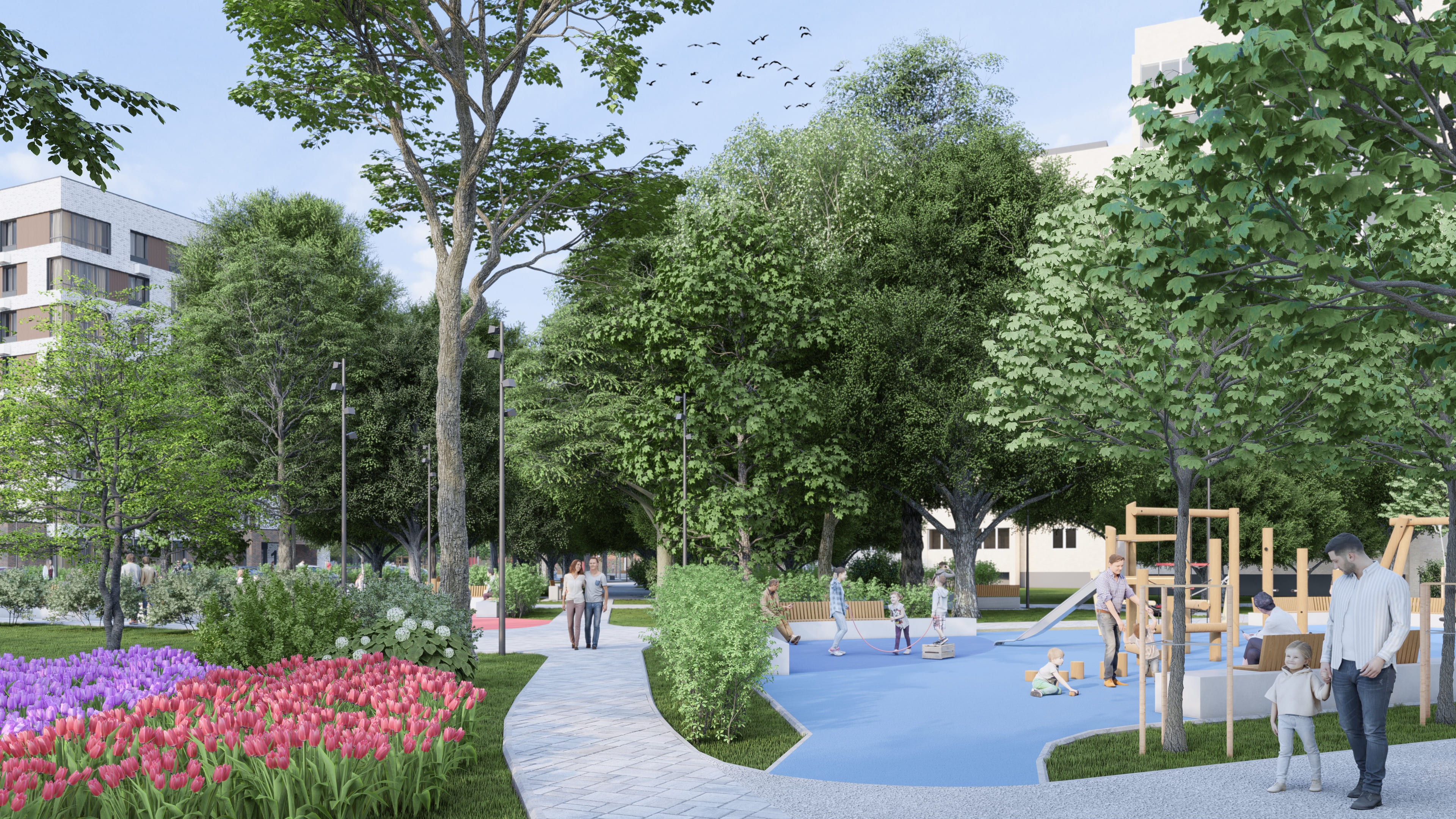 Дворы без машин, зелёные парковые зоны с площадками для детей и взрослых, а также безопасная и уютная атмосфера.